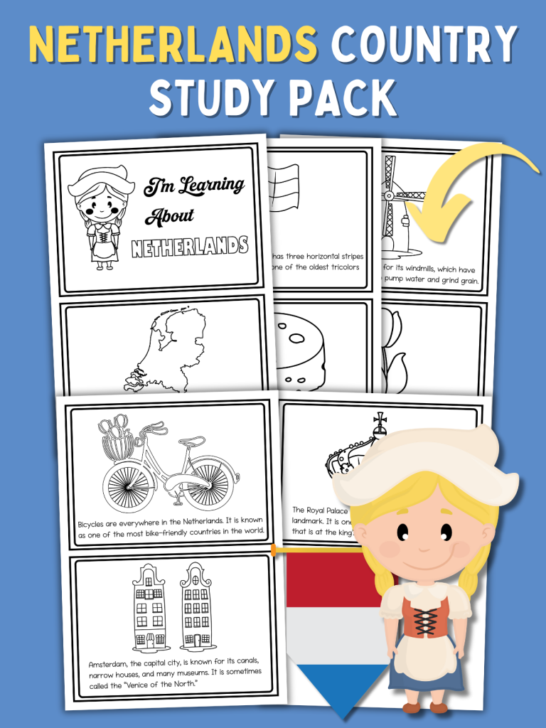 Bring the charm of the Netherlands into your classroom or home with this free Netherlands Country Study Pack for kids. Each page features fun facts and simple illustrations that make world learning easy and enjoyable.