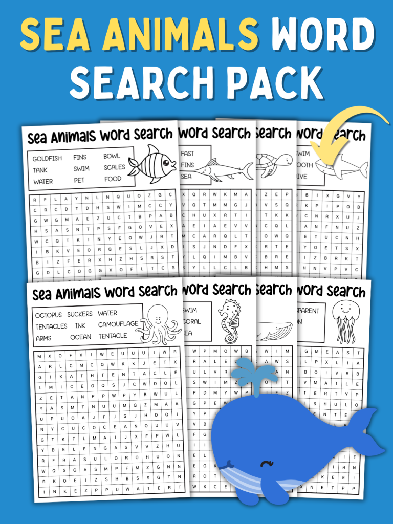 This printable set includes a collection of sea animal–themed word searches, each focused on a different creature. Every page has words connected to that animal’s life in the ocean, making it both a literacy and science learning tool in one.